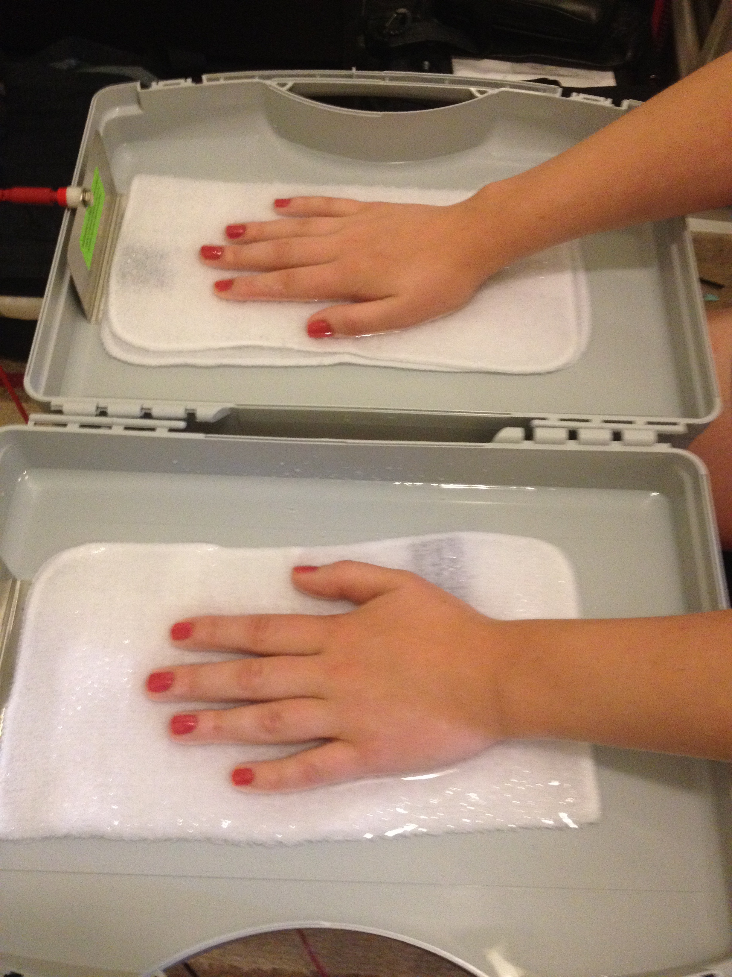 Finally, after making sure everything was hooked up correctly, I was ready for my first test with the device. Each of my hands rested in a tray on top of the cloth covering the metal plates. We were ready to turn the machine on.